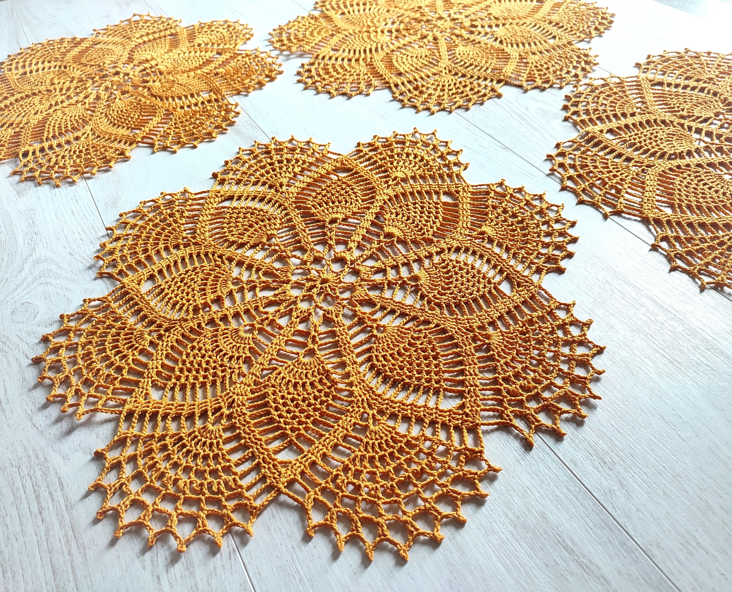 Beautiful golden colour crochet doilies are ready to be sent to their new homes! Made of 100% natural materials, these doilies will definitely brighten up your home or be a perfect gift for your loved ones! This doilies are made with thicker yarn and will protect your table surface and brighten up your mood at the same time!