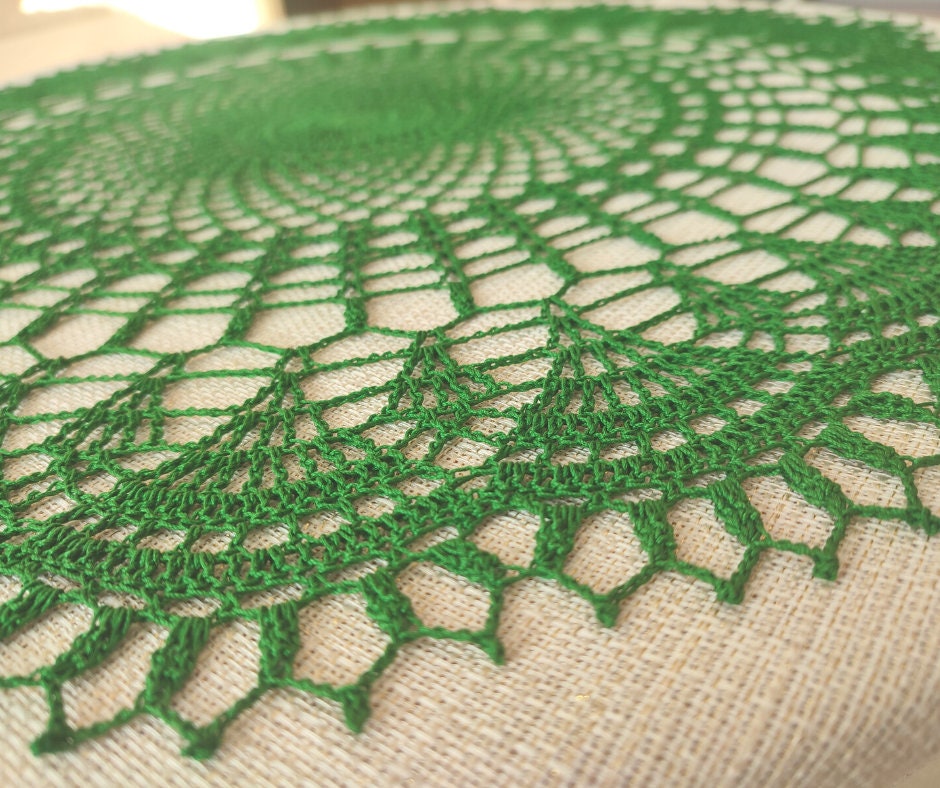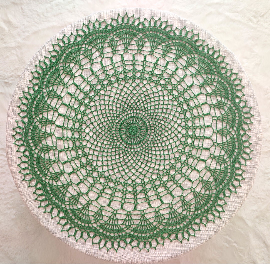 Dark green crochet doily 55cm. Handmade cotton centrepiece in vibrant green colour.