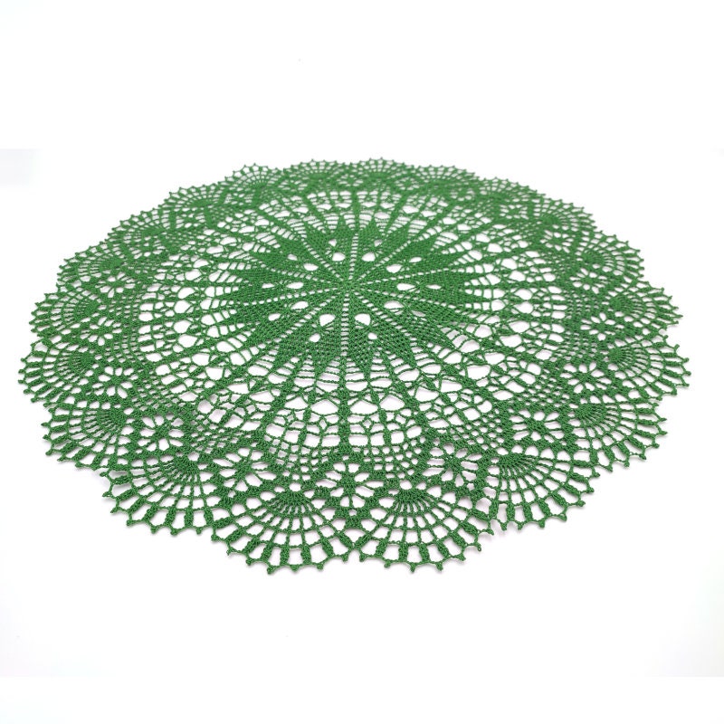 Delicate handmade doily in gorgeous deep green colour. Light and thin as a spider web, it will bring a special touch of elegance to your home.