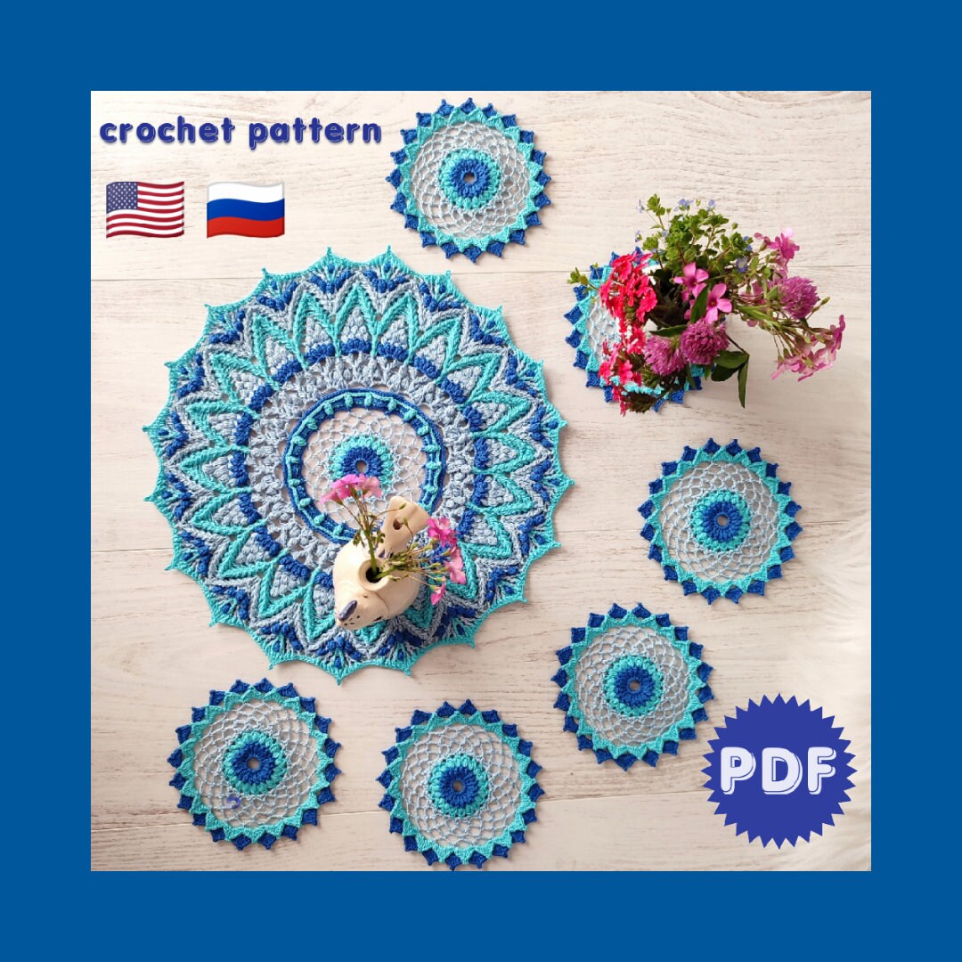 Crochet doily and coaster pattern pdf, detailed tutorial with a text description and a chart for making a 3D textured Morning Dew set.