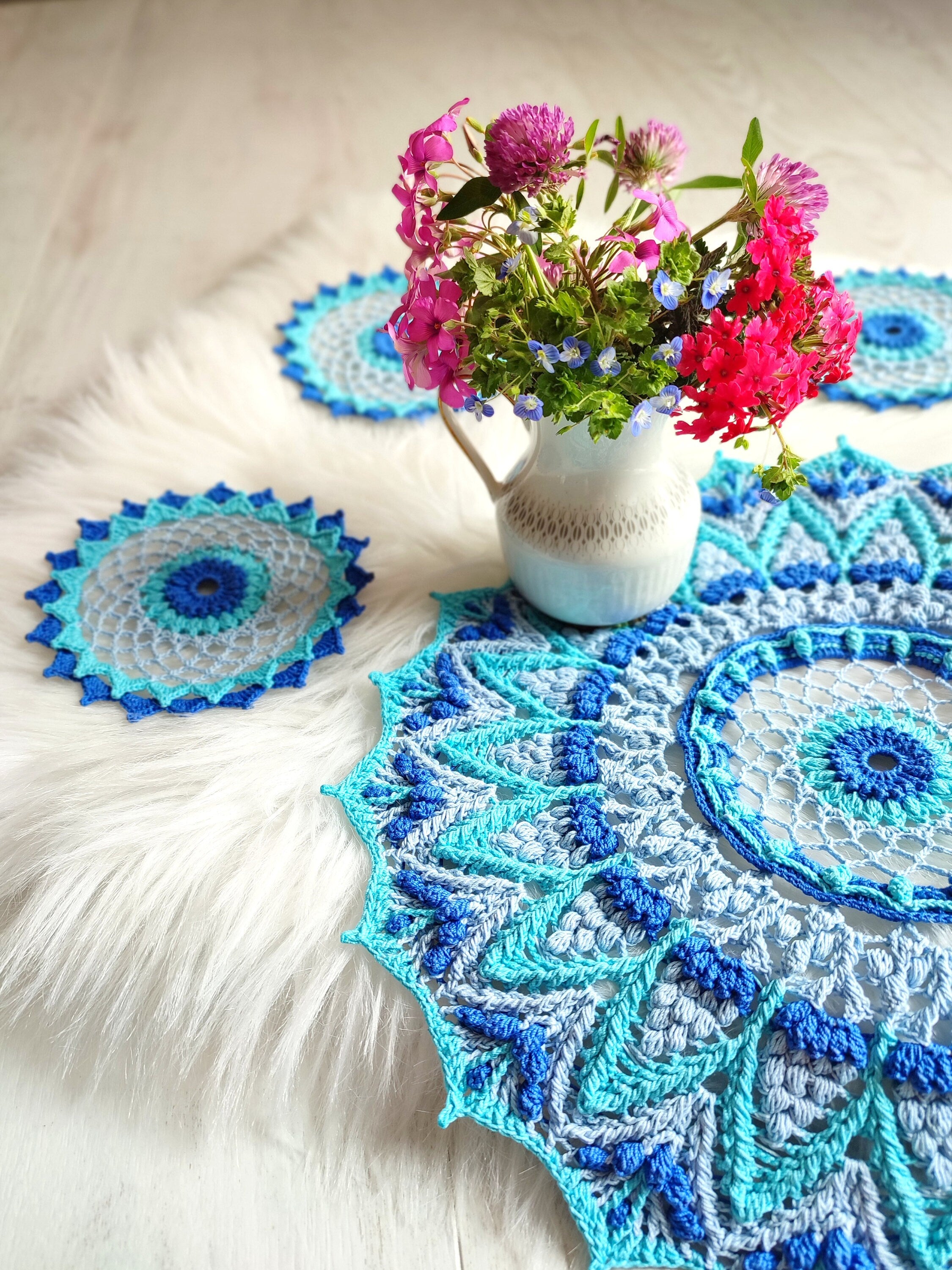 "Morning Dew" crochet set of a centrepiece and coasters by Erika Downie ( @erikas_lace )