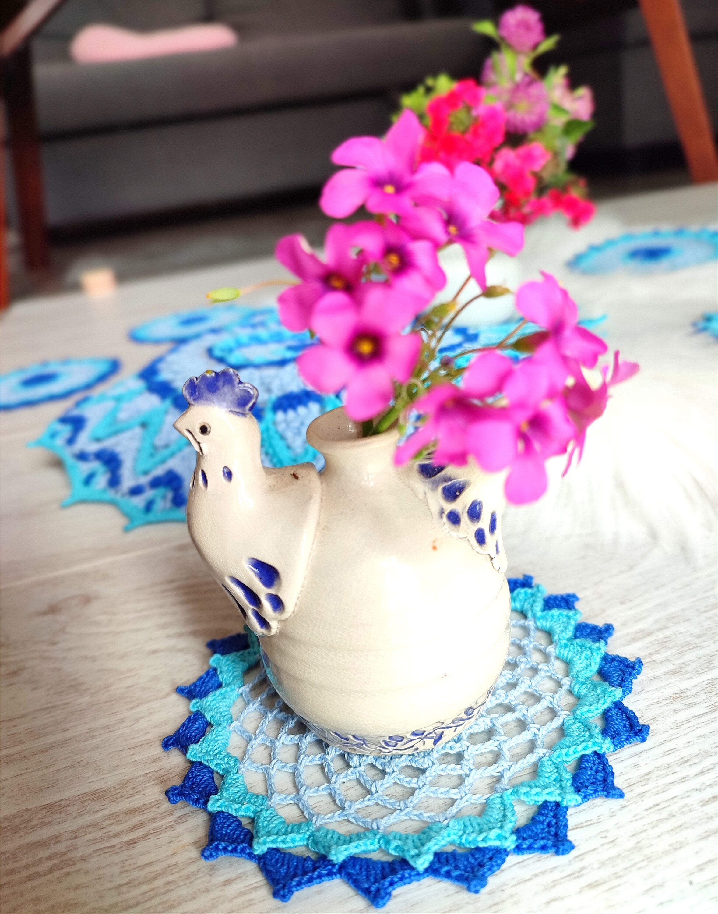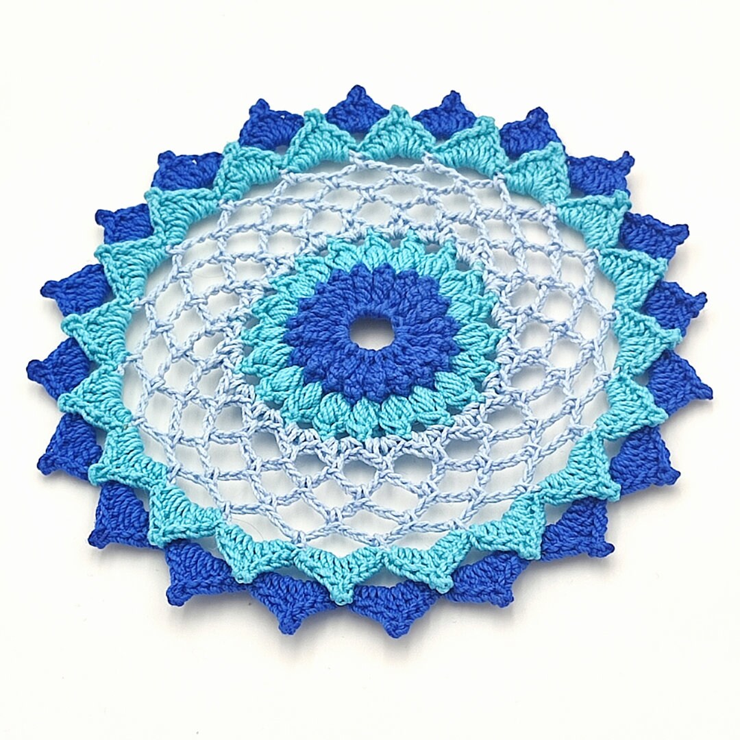 Morning Dew is a pattern for a beautiful 3D coaster textured and stylish-looking. It has some 3D elements and has a very sophisticated textured look. The finished item can be used as a coaster or a part of a wall hanging mandala/dreamcatcher. If made of very fine thread can be turned into very cute earrings.
