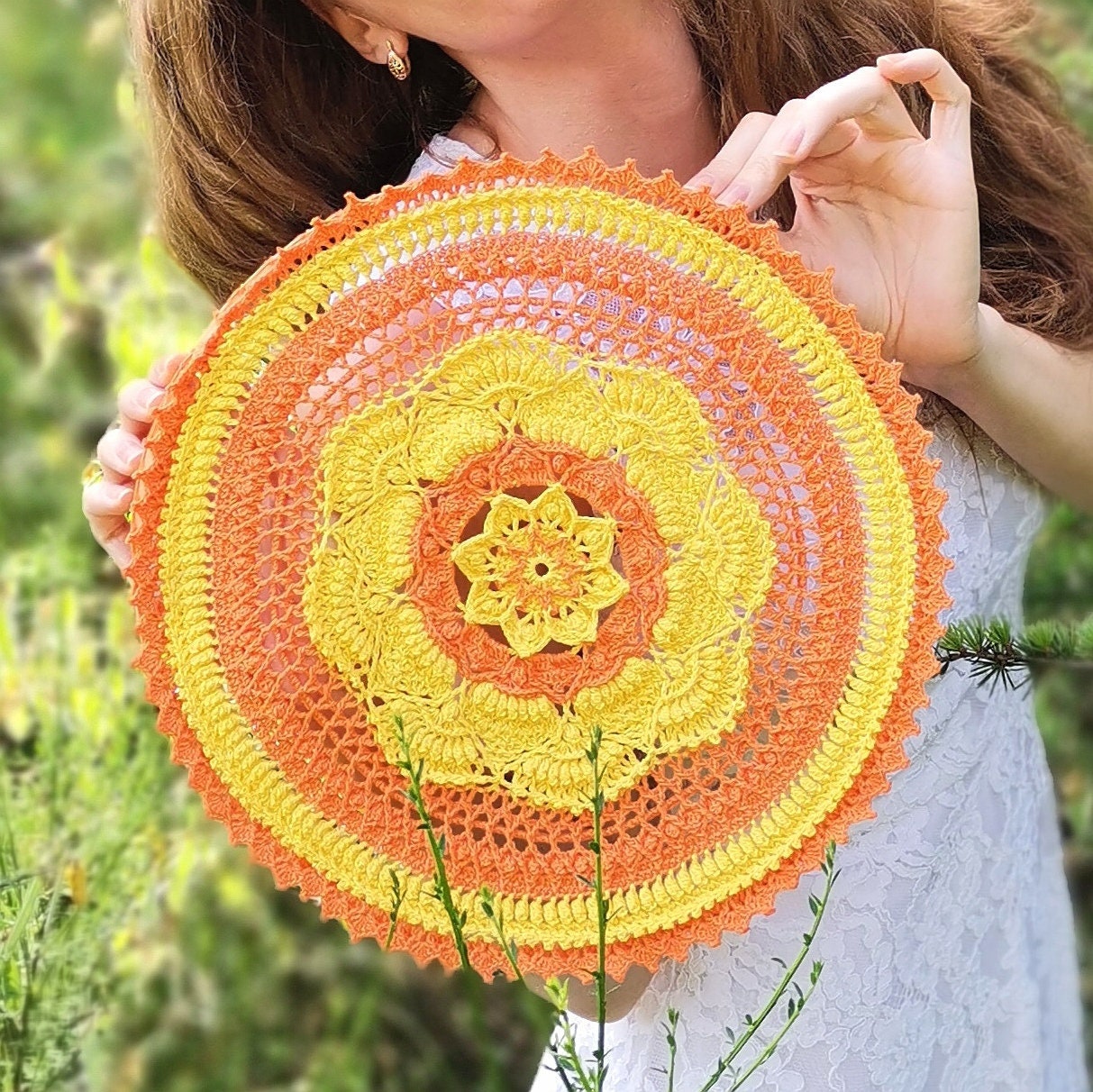 Textured crochet doily pattern, June Flower 3D mandala crochet tutorial, chart and description for a round textured flower doily