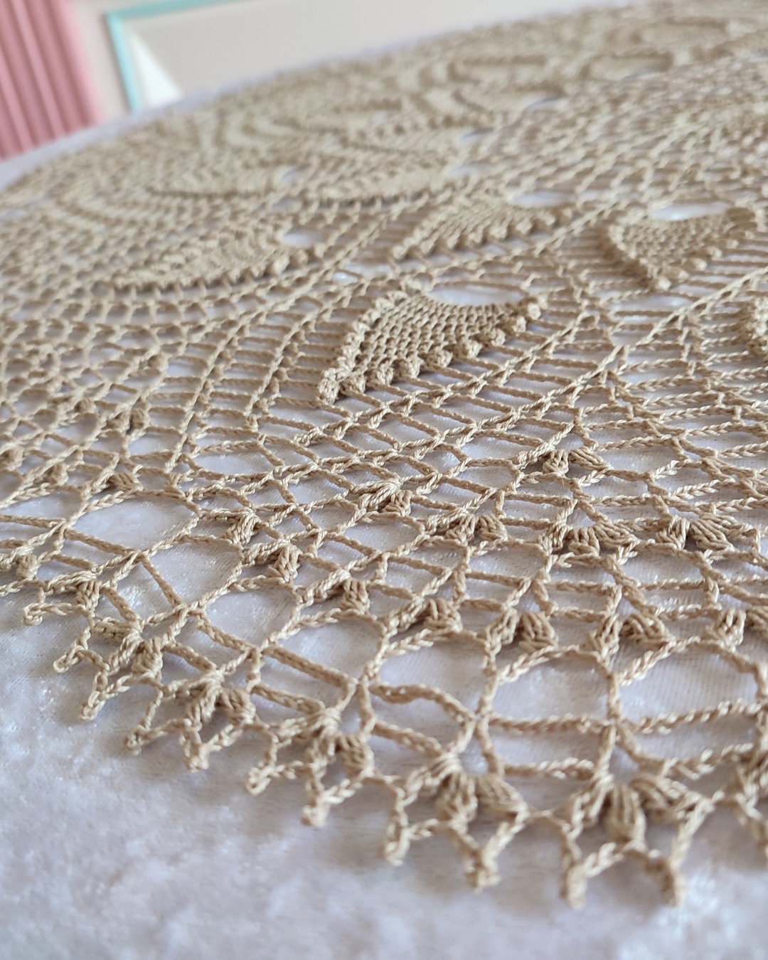 Delicate and airy handmade large doily/tablecloth for a round table, made in beautiful beige (coffee with milk) colour, light and thin, it will bring a special touch of elegance to your home.