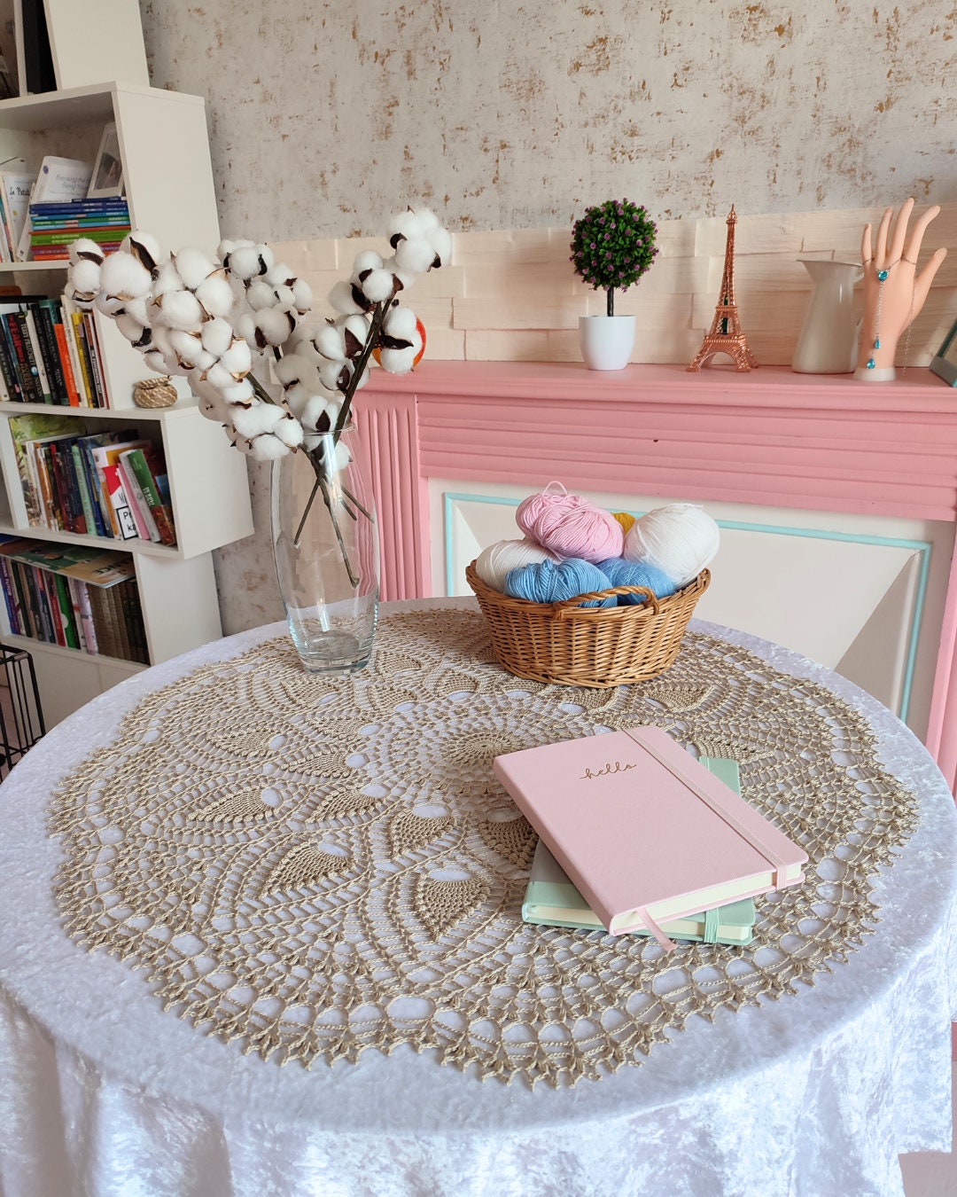 This large centrepiece (75cm diameter ) can be used as a beautiful doily or as a tablecloth for a round coffee table.