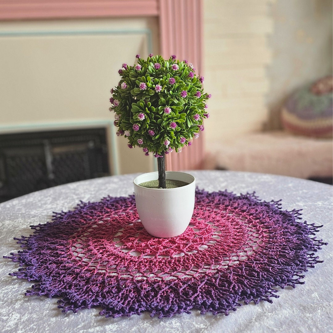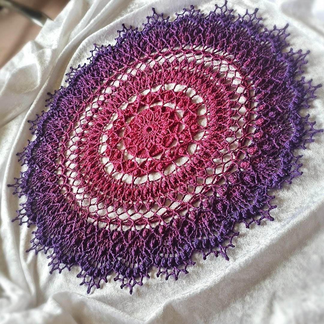 One-of-a-kind Large Textured Crochet Doily in fuchsia pink and purple colours 47cm diameter. Crocheted with great precision with a lot of 3D elements and sophisticated colour change. This is my own mandala design called "Amelie".