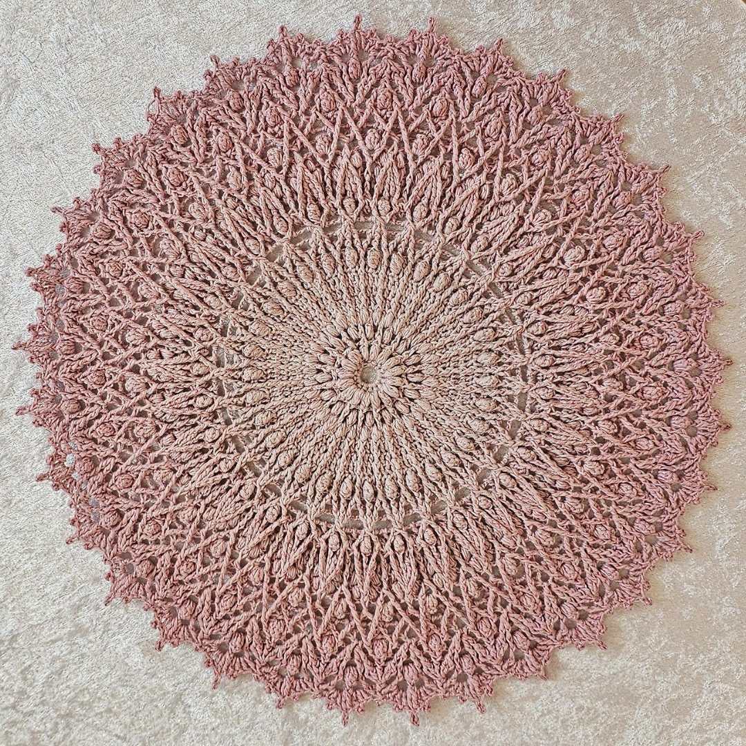 Pink crochet textured doily with glitter. Crochet round table topper in light tender pink going from a lighter shade in the middle to a slightly darker one at the edges. It is made with a very thin glitter thread to add some festive mood. This mandala is my latest design called "Sparkling Dreams".